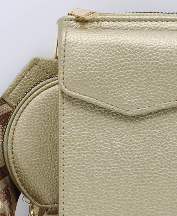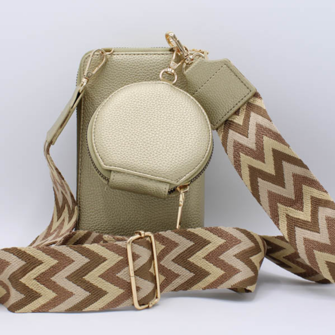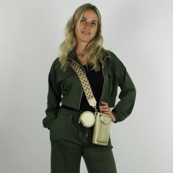 Feestelijke gouden telefoontas met een brede verstelbare schouderriem in een leuke print!