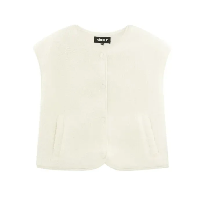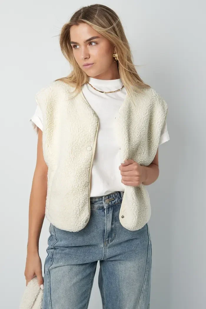 Leuk gilet in teddy stof, met knopen.Zit comfortabel en maakt de outfit helemaal cozy en compleet.