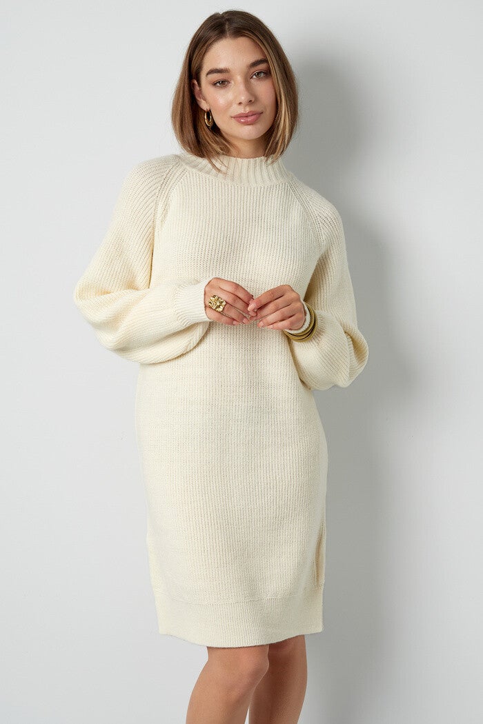 Comfy gebreide midi jurk met een split aan de zijkanten, super leuk om te combineren met stoere boots of hippe sneakers.