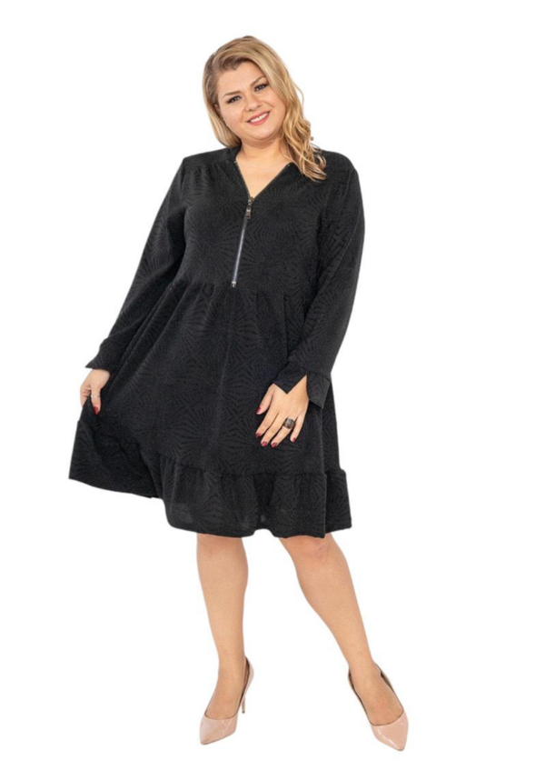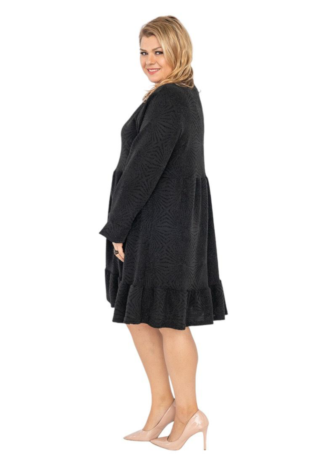 Glitter jurk met v-hals en rits. De jurk heeft fijn en mooi detailwerk met glitters en ziet er super feestelijk uit. Aan de onderkant van de mouwen zit een split. Het is een leuk model en valt goed.