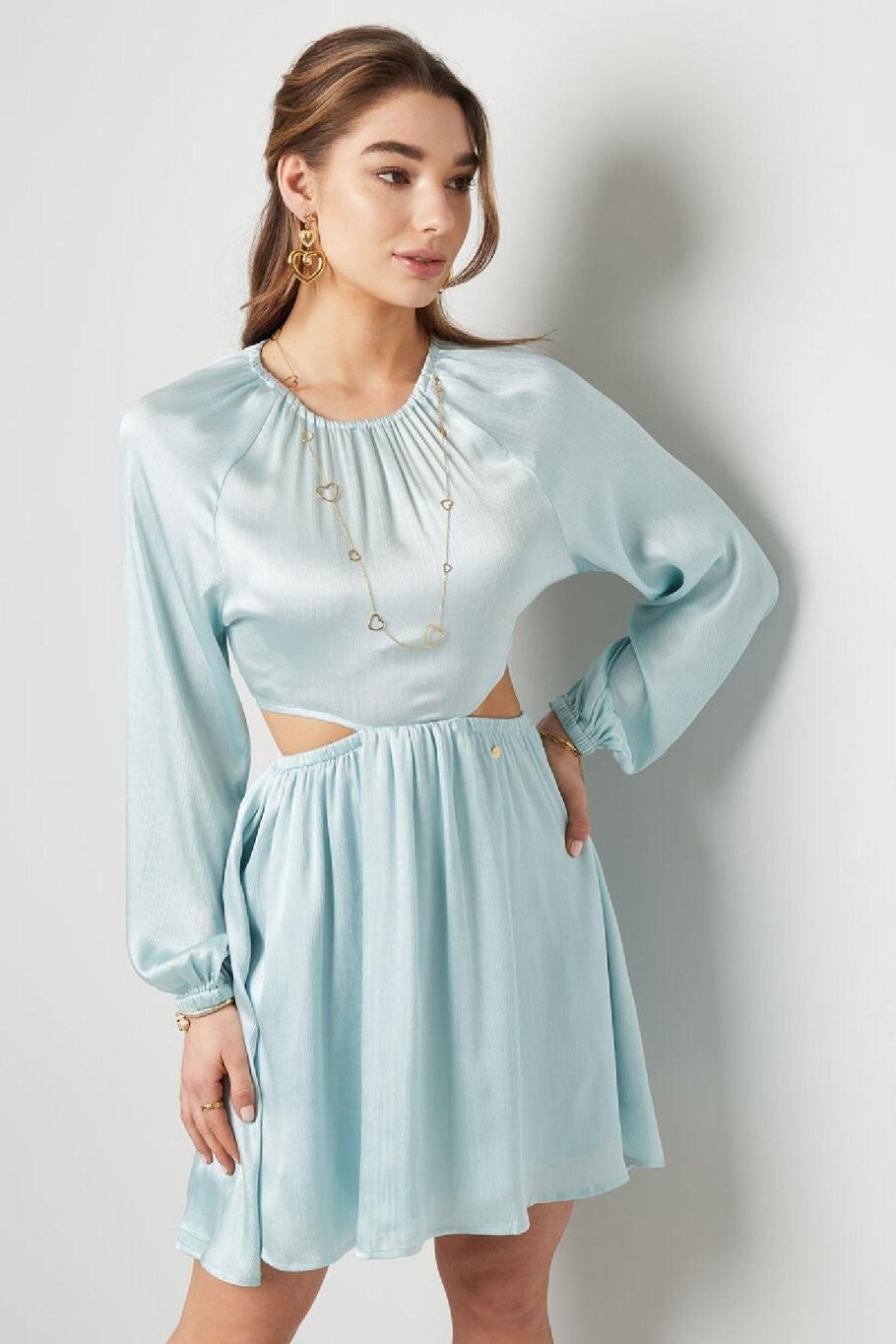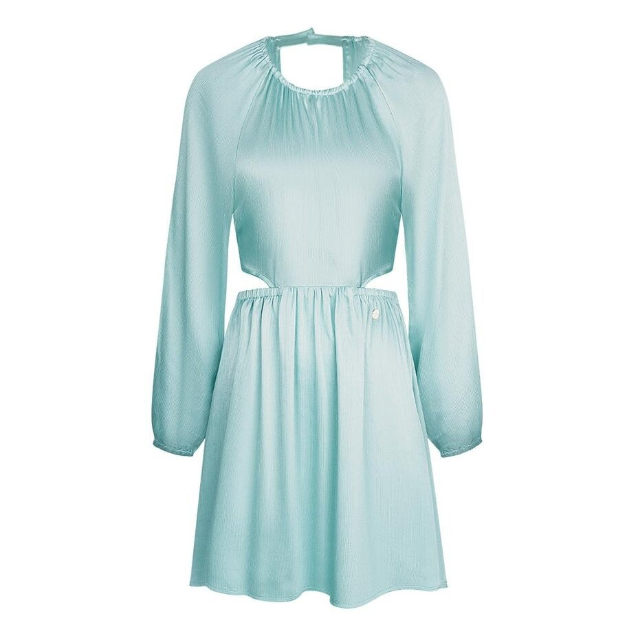 De jurk valt net boven de knie en is verkrijgbaar in mintblauw en roze.