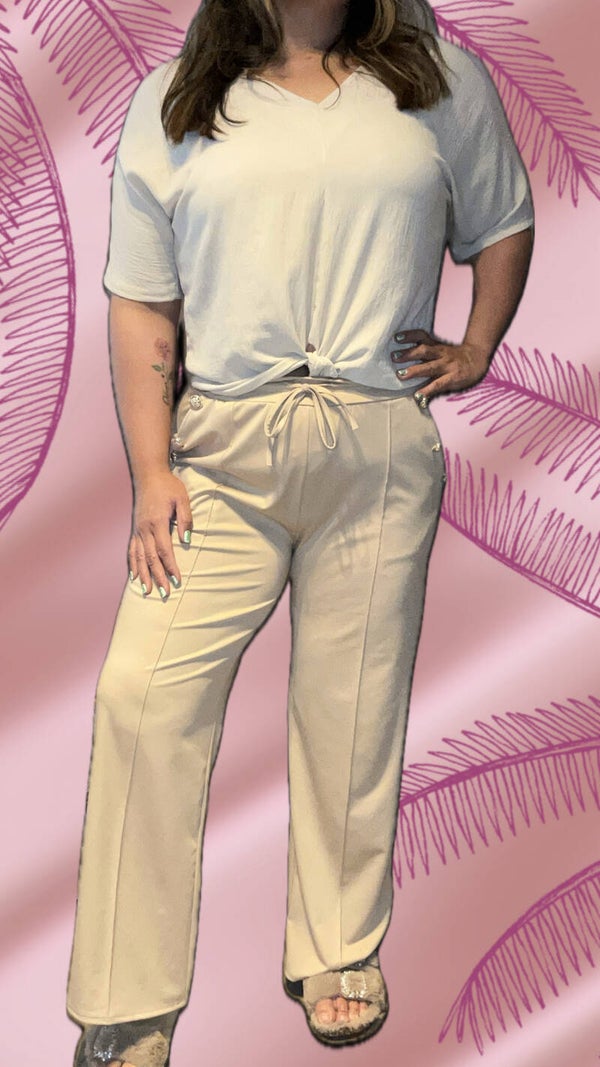 Deze broek is gemaakt van een soepele stof, voelt zacht en draagt comfortabel. Het heeft 2 zakken, er loopt een speelse lijn in het midden van de broekspijpen en is versierd met knopen.