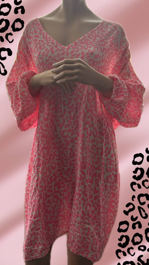 Deze luchtige jurk van 100% katoen is perfect voor warme dagen én stijlvolle momenten. Met haar lange mouwen en relaxte pasvorm biedt ze zowel comfort als flair. De speelse luipaardprint geeft de jurk een opvallend accent, verkrijgbaar in twee toffe varianten: wit met zwarte luipaardprint voor een tijdloze look, of wit met neon roze luipaardprint voor wie durft te knallen. Een must-have voor je zomergarderobe!