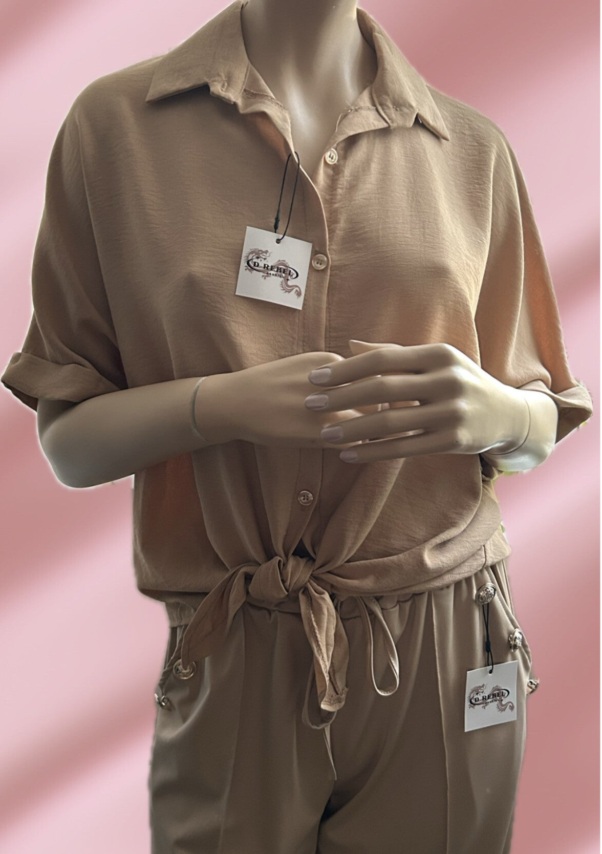 Deze stijlvolle beige blouse is een veelzijdige toevoeging aan je garderobe. Met een klassieke kraag, knoopjes en een speels knoopdetail aan de voorzijde straalt ze een nonchalante elegantie uit. De luchtige pasvorm maakt het comfortabel én flatterend.