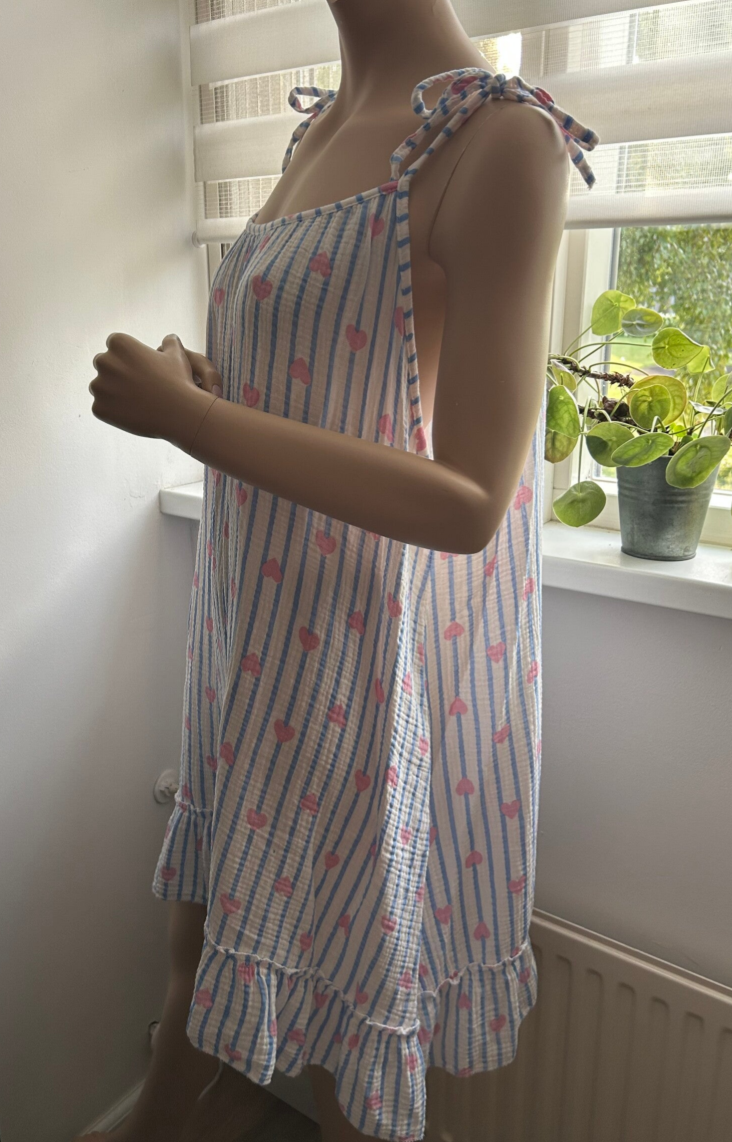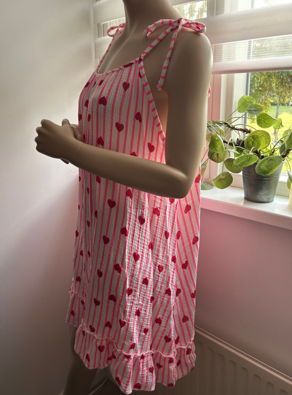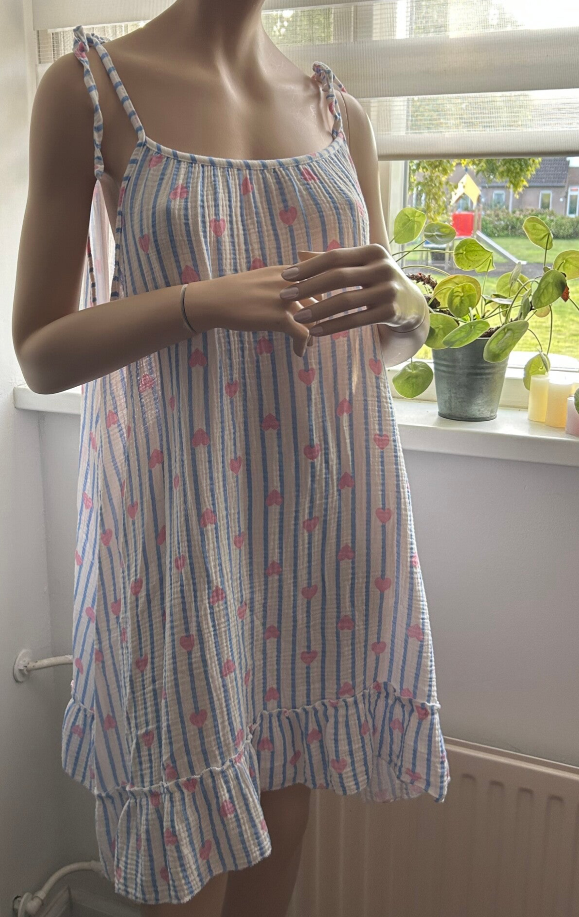 Deze luchtige jurk met schattige hartjesprint is een echte zomerse must-have! De zachte katoenen stof zorgt voor ultiem draagcomfort, terwijl de print een speelse en vrouwelijke touch geeft. Wat leuk is is dat je de touwtjes bijde schouders kunt strikken en verstellen naar wens.
