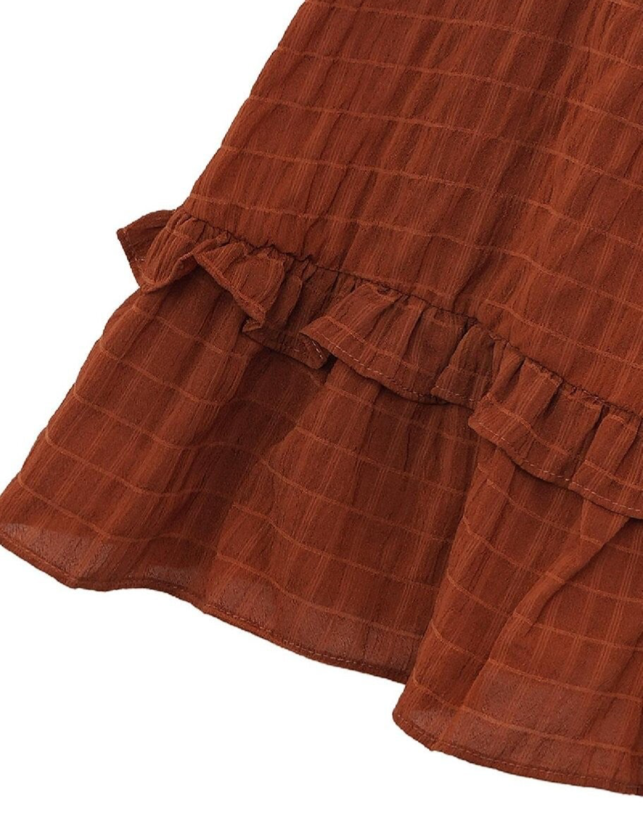 Deze speelse jurk in warme roestkleur straalt een vrolijke countrystijl uit. Met charmante ruches en een zwierige pasvorm is ze perfect voor een spontane dag of een festivallook.