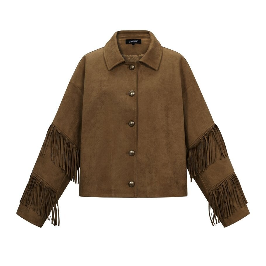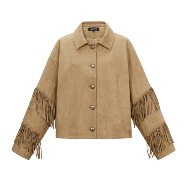 Dit aankomende seizoen ben jij een trendsetter met dit stoere jacket in een suèdelook en speelse fringes.